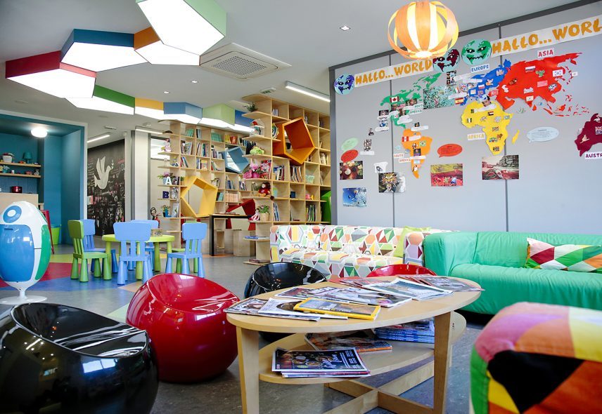 Υπερσύγχρονες, πολύχρωμες και φιλόξενες εγκαταστάσεις με μεγάλους και άνετους χώρους γεμάτους χρώμα, φως και έργα μαθητών, όπως ο «διαδραστικός» παγκόσμιος χάρτης, οι ζωγραφιές στον χώρο αυτοέκφρασης για την Παγκόσμια Ημέρα της Ειρήνης, οι φωτογραφίες από τα εκπαιδευτικά ταξίδια στην Αγγλία, αλλά και οι αφίσες με τα ονόματα των 141 επιτυχόντων στις εξετάσεις γλωσσομάθειας είναι η πρώτη εικόνα που συναντά κάποιος μπαίνοντας στο Manetaki Language School στην Βάρη. Εκείνο όμως το αρχιτεκτονικό στοιχείο που κάνει τον χώρο πραγματικά ξεχωριστό είναι η πολύχρωμη βιβλιοθήκη – παιδότοπος που αποτελεί το κέντρο της Σχολής και παράλληλα το σημείο συνάντησης για σκάκι, επιτραπέζια παιχνίδια ή ανάγνωση λογοτεχνικών βιβλίων. Στο βάθος, το coffee corner, προσφέρει μια γωνιά χαλάρωσης με δωρεάν ζεστά ροφήματα, καθώς το Manetaki Language School προνοεί όχι μόνο για τις ανάγκες των παιδιών αλλά και για τις ανάγκες των γονέων και των ενήλικων μαθητών του.