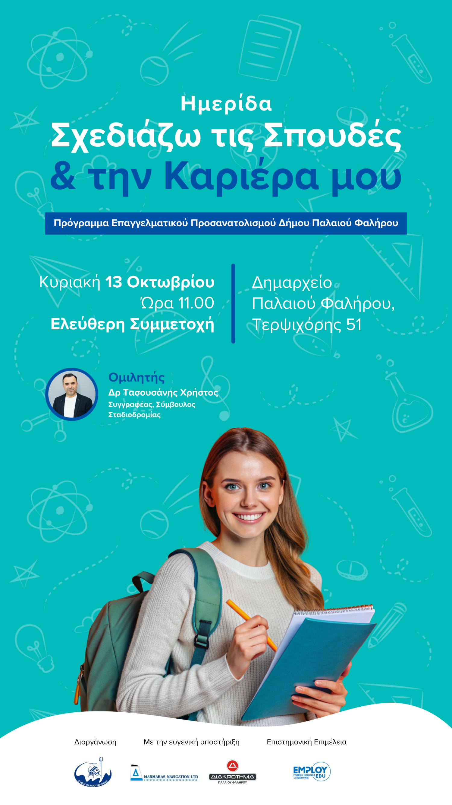 Με στόχο την υποστήριξη των νέων και των οικογενειών τους, ο Δήμος Παλαιού Φαλήρου σε συνεργασία με την «EMPLOY EDU Σύμβουλοι Εκπαίδευσης & Σταδιοδρομίας» προσφέρει μια σειρά δωρεάν σεμιναρίων επαγγελματικού προσανατολισμού. Η πρωτοβουλία αυτή στοχεύει να δώσει στους μαθητές της περιοχής τα κατάλληλα εφόδια για να κάνουν τις σωστές εκπαιδευτικές και επαγγελματικές επιλογές, αντιμετωπίζοντας την αβεβαιότητα της σύγχρονης αγοράς εργασίας.