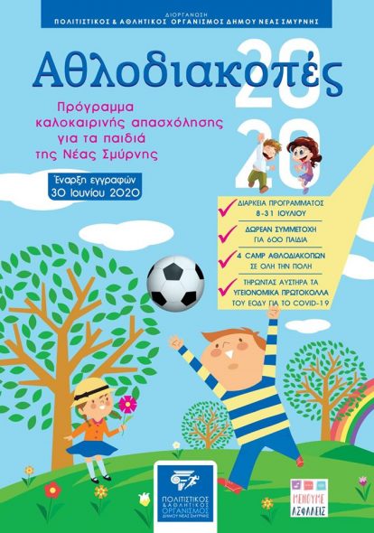 Από τις 8 έως τις 31 Ιουλίου ο Πολιτιστικός και Αθλητικός Οργανισμός Νέας Σμύρνης, θα πραγματοποιήσει και φέτος όπως κάθε καλοκαίρι το πρόγραμμα των Αθλοδιακοπών.