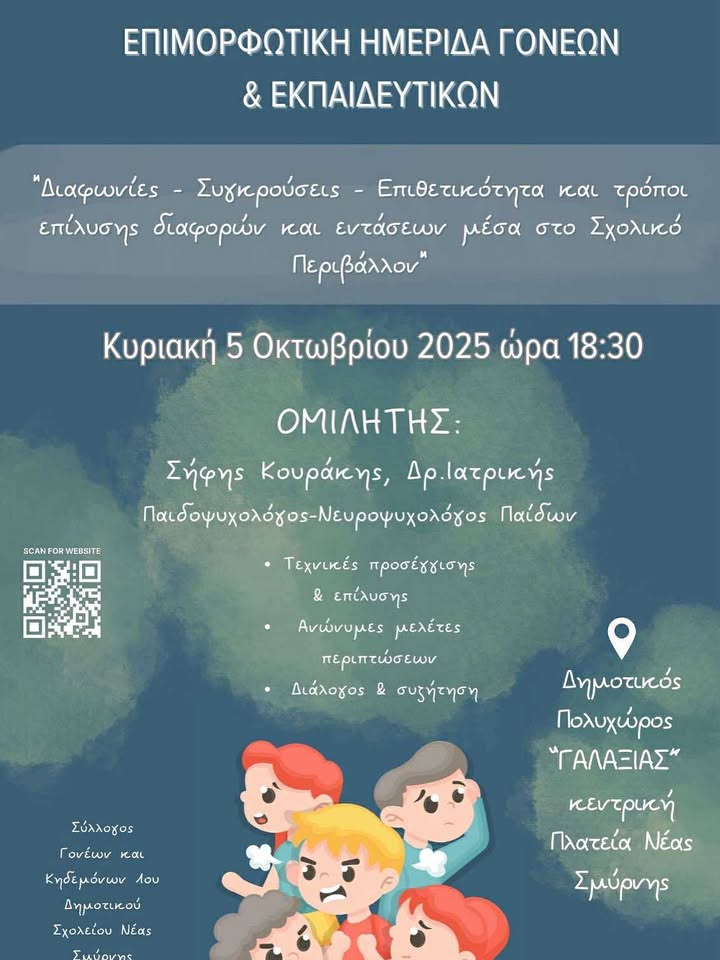 Με στόχο την ευαισθητοποίηση και την ενδυνάμωση της σχολικής κοινότητας γύρω από ζητήματα κοινωνικών σχέσεων και συγκρούσεων, ο Σύλλογος Γονέων & Κηδεμόνων του 1ου Δημοτικού Σχολείου Νέας Σμύρνης διοργανώνει την πρώτη Επιμορφωτική Ημερίδα Γονέων & Εκπαιδευτικών, την Κυριακή 5 Οκτωβρίου 2025, στις 18:30, στον Γαλαξία της Πλατείας Νέας Σμύρνης.