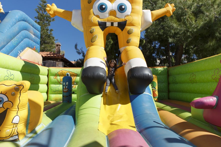 Στον εξωτερικό χώρο πρωταγωνιστής είναι αδιαμφισβήτητα ο Μπομπ Σφουγγαράκης αφού ο πολύχρωμος φουσκωτός κόσμος του καταλαμβάνει μεγάλο μέρος του κήπου. Εδώ μπορούν να παίξουν παιδιά από 3 μέχρι 10 ετών. Λίγο πιο πέρα, η πίστα survivor διασφαλίζει ότι τα μεγαλύτερα παιδιά (πάνω από 5 ετών) δεν πρόκειται να βαρεθούν ούτε στιγμή, ενώ το τραμπολίνο, που απευθύνεται σε όλες τις ηλικίες, είναι το αγαπημένο παιχνίδι μικρών και μεγάλων. Κάθε παιδί μπορεί να προμηθευτεί μάρκες για τα παιχνίδια στα οποία επιθυμεί να συμμετάσχει, ωστόσο διατίθενται και all day passes για ατελείωτη διασκέδαση που πραγματικά μπορεί να διαρκέσει από το πρωί μέχρι το βράδυ!