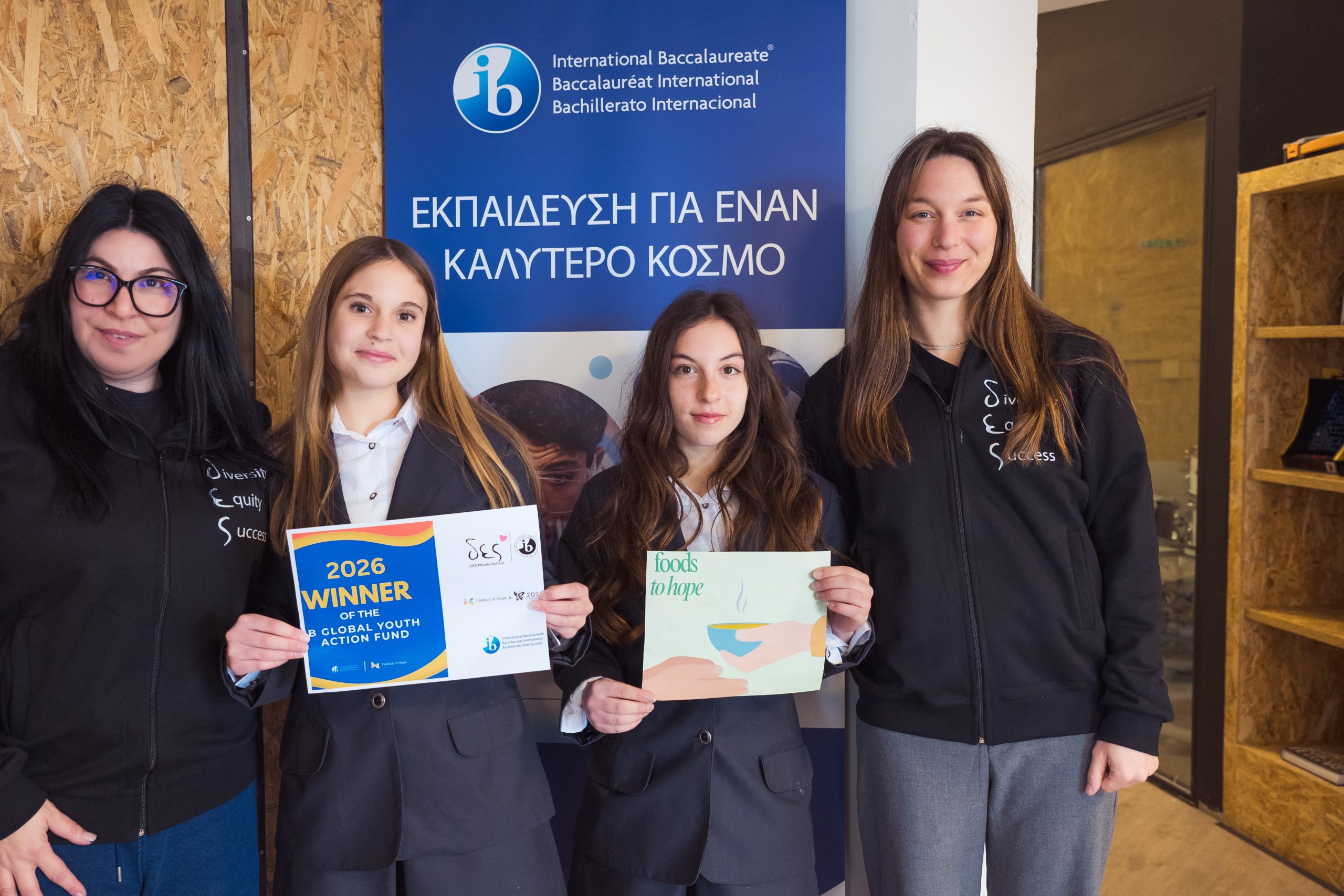 Σε αυτό το παγκόσμιο πλαίσιο δράσης και αλλαγής, το Διαδραστικό Ευρωπαϊκό Σχολείο (Interactive European School DES) ανακοινώνει με ιδιαίτερη υπερηφάνεια ότι οι μαθήτριες του Γυμνασίου, Ίνω Παριάρου και Αντζελίνα Δρόσου, συγκαταλέγονται στους φετινούς νικητές του IB Global Youth Action Fund. Μέσα από αυτή τη σημαντική διάκριση, εξασφάλισαν χρηματοδότηση για την υλοποίηση του εμπνευσμένου τους έργου «Foods to Hope».