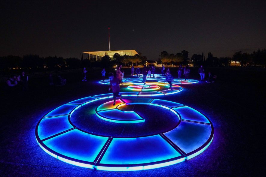 Ακολουθήστε τις φωτεινές διαδρομές του εμπνευσμένου από τη φυσική συμμετρία Aqueous της Jen Lewin στο Ξέφωτο. Παίξτε με τις διαδραστικές πλατφόρμες του, που είναι σχεδιασμένες για να ανιχνεύουν τις ανθρώπινες κινήσεις.