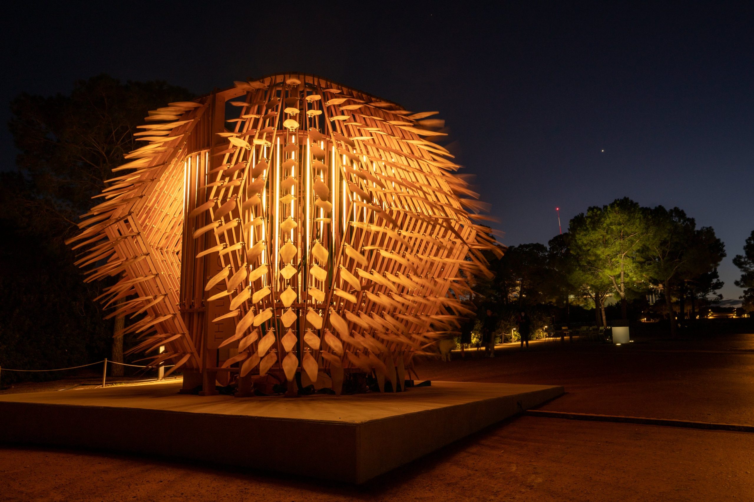 Συνεχίζοντας τη βόλτα σας προς τον Πευκώνα, συναντήστε το Living Lantern των NEON και της Frankie Boyle Studio, ένα κινητικό έργο που συνδυάζει φως, χρώμα και μορφή και χαρίζει μια ευεργετική ανάπαυλα διαλογισμού.
