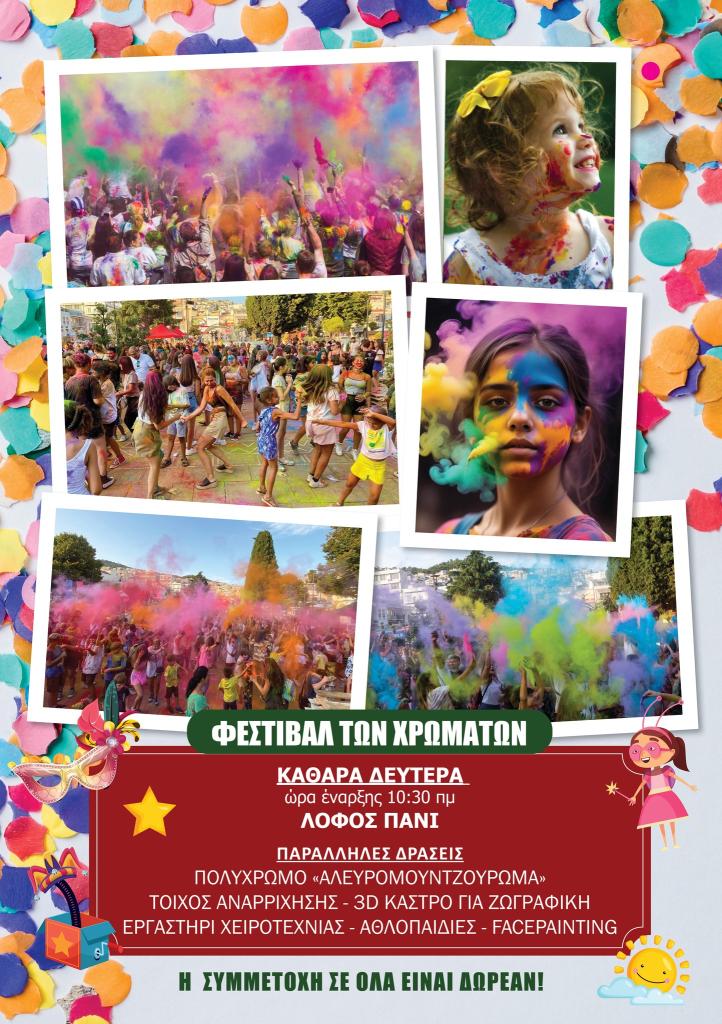 Ο Δήμος Αλίμου, στο πλαίσιο των εκδηλώσεων για τα Κούλουμα, διοργανώνει ένα ξεχωριστό Φεστιβάλ Χρωμάτων, που θα μετατρέψει τον Λόφο Πανί σε έναν ζωντανό καμβά διασκέδασης. Οι επισκέπτες θα έχουν την ευκαιρία να συμμετάσχουν σε ρίψη χρωμάτων, δημιουργώντας ένα μοναδικό σκηνικό, μουσικές εκδηλώσεις, που θα δώσουν ρυθμό στη γιορτή και δημιουργικά εργαστήρια για παιδιά και ενήλικες.