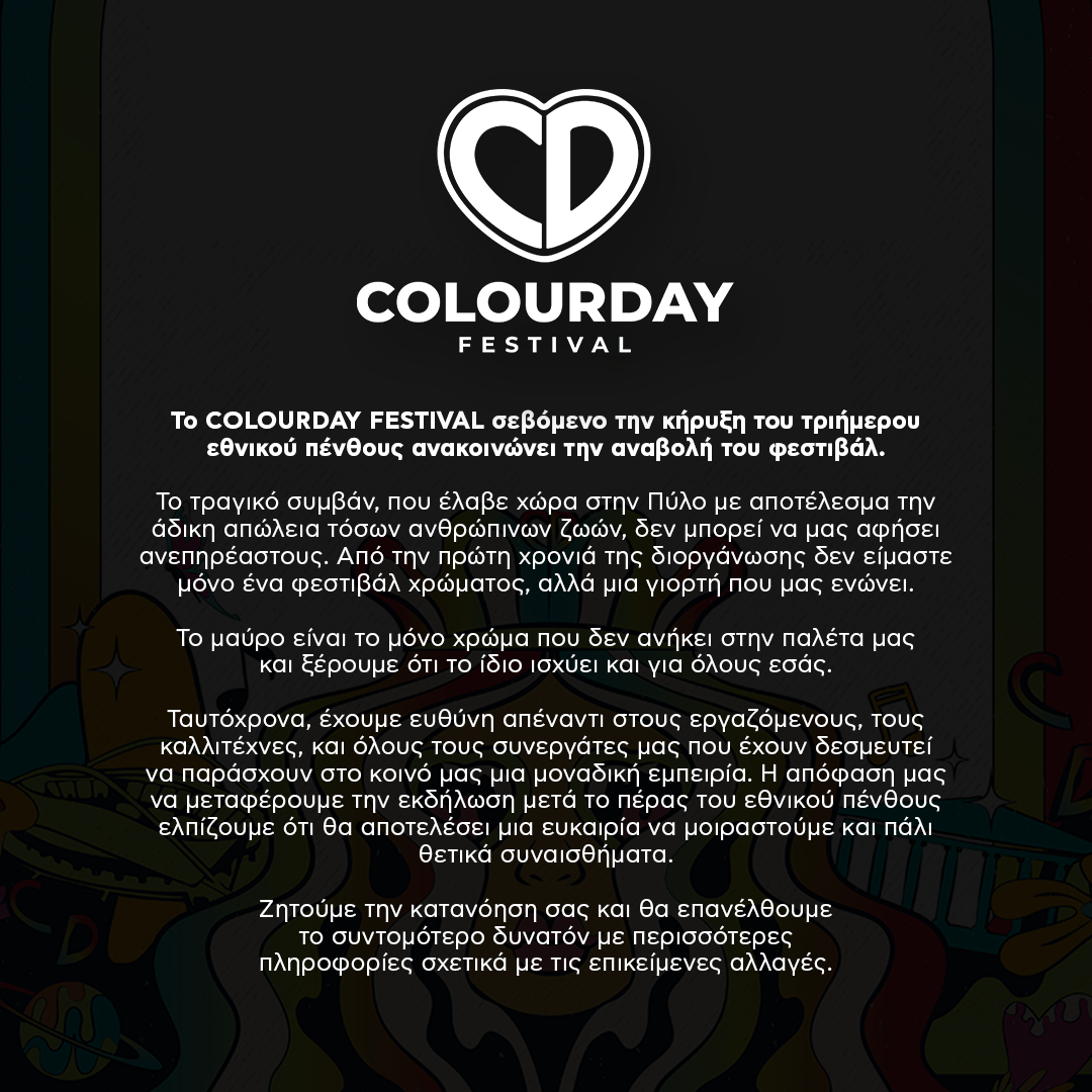 Το Colour Day Festival εξέδωσε ανακοίνωση για την αναβολή του, λόγω του τριήμερου εθνικού πένθους.