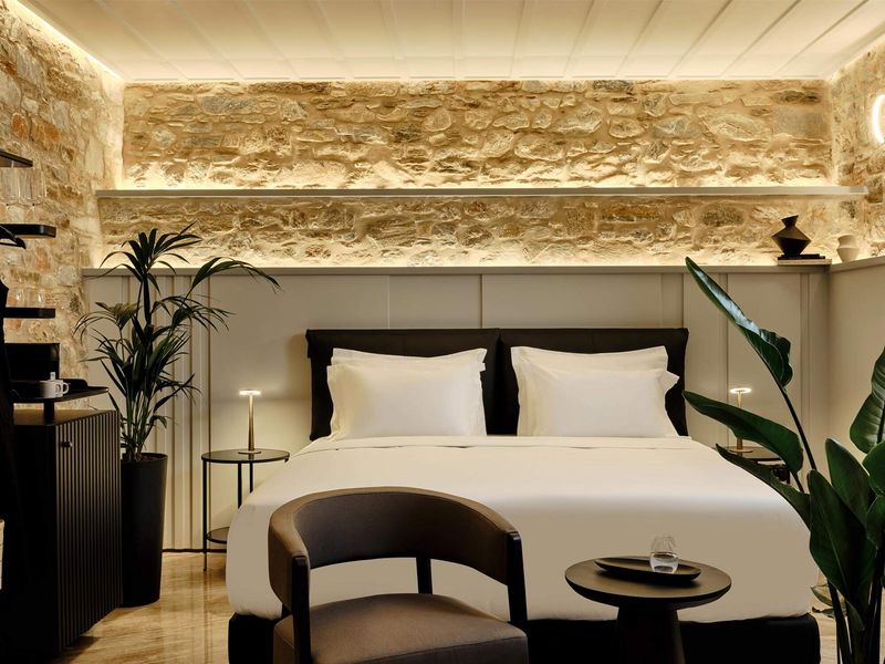 Οι ιστορικές μνήμες εναρμονίζονται πλήρως με σύγχρονες αναφορές design από διεθνείς οίκους όπως Gessi, Flos, Artemide, Panzeri, TOOY, ΑSTRO, Poltrona Frau, Buster + Punch συντελώντας σε ένα σύνθετο δημιούργημα αρχοντικής φιλοξενίας. Αισθητική και λειτουργικότητα βρίσκουν πρόσφορο έδαφος σε μια bespoke προσέγγιση interior design που τοποθετεί το μάρμαρο σε πρωταγωνιστικό ρόλο. Μάρμαρα όπως Covelano Macchia Vecchia, Azul Cielo, λευκά μάρμαρα Διονύσου και Grigio Carnico μεταξύ πολλών άλλων, συμπληρώνουν αρμονικά, ως φυσική συνέχεια, την διακόσμηση των δωματίων.
