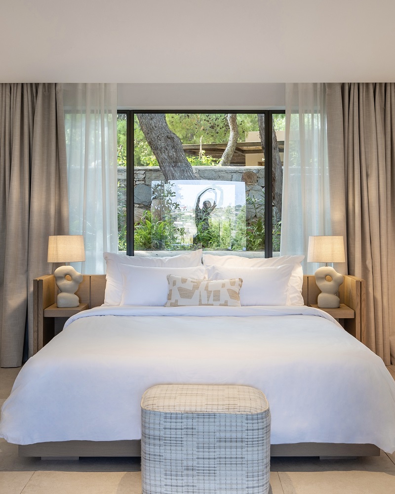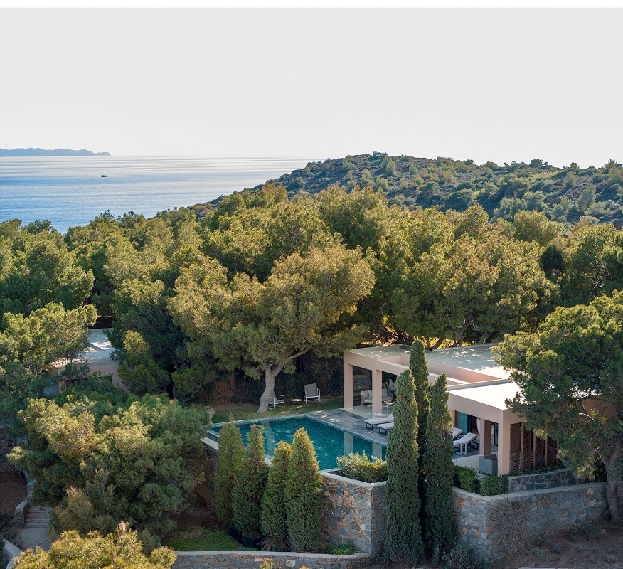 Τα αμφιθεατρικά χτισμένα bungalows, οι σουίτες και οι βίλες με τις ιδιωτικές πισίνες, απόλυτα εναρμονισμένα με το παρθένο πευκοδάσος και την εντυπωσιακή θέα στο Ναό και στον κόλπο του Σουνίου, χαρακτηρίζονται από αιθέρια αισθητική, γήινα υλικά και όλες τις λεπτομέρειες design και περιποίησης που κάνουν τη διαφορά.