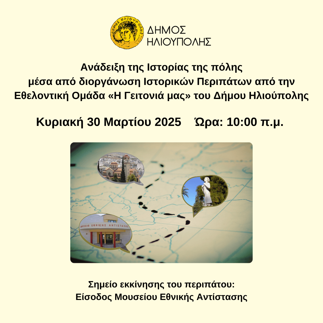 Η Εθελοντική ομάδα «Η Γειτονιά μας» του Δήμου Ηλιούπολης διοργανώνει τον 1ο Ιστορικό Περίπατο της πόλης την Κυριακή 30 Μαρτίου, με ξεναγό τον εθελοντή καθηγητή Ιστορίας του Κοινωνικού Φροντιστηρίου της πόλης κ. Παύλο Παπαθανασίου.