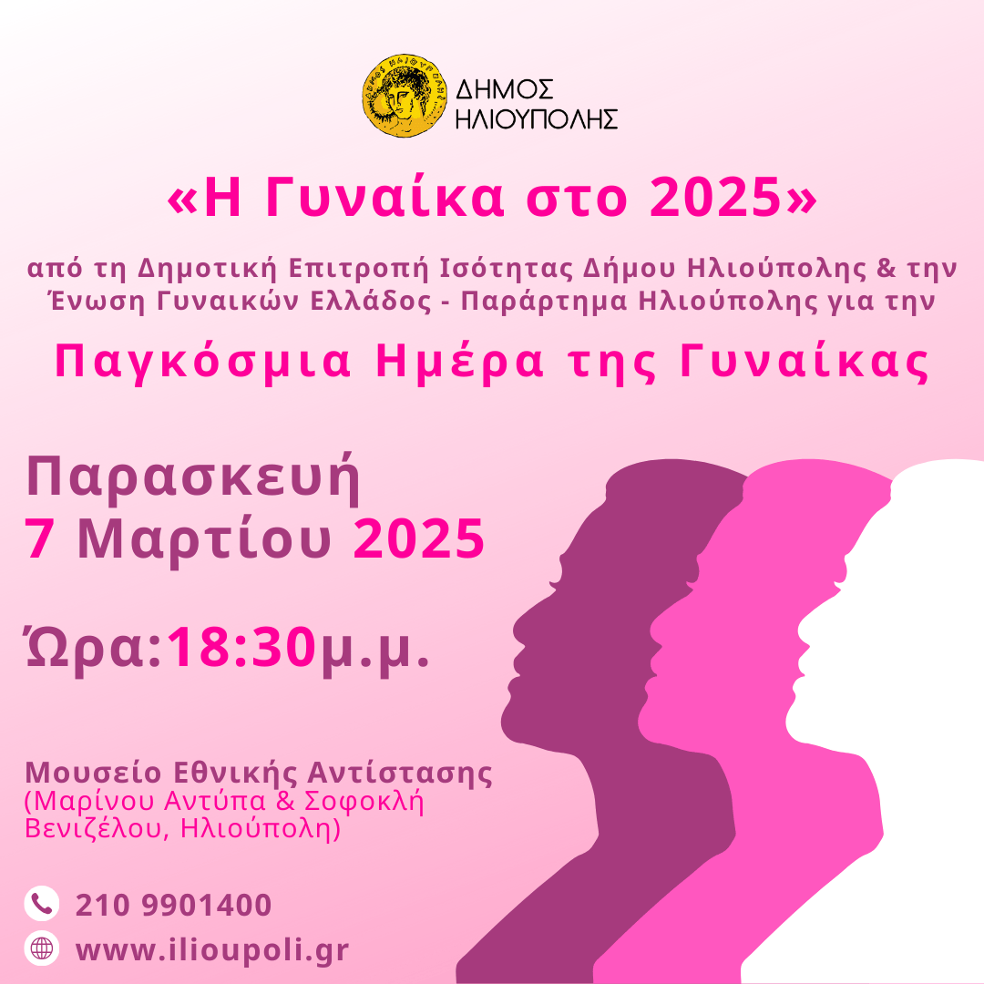 Με αφορμή την Παγκόσμια Ημέρα της Γυναίκας, η Δημοτική Επιτροπή Ισότητας του Δήμου Ηλιούπολης και η Ένωση Γυναικών Ελλάδος – Παράρτημα Ηλιούπολης διοργανώνουν εκδήλωση στις 7 Μαρτίου 2025, εστιάζοντας στις προκλήσεις και τις κατακτήσεις των γυναικών στη σύγχρονη κοινωνία.