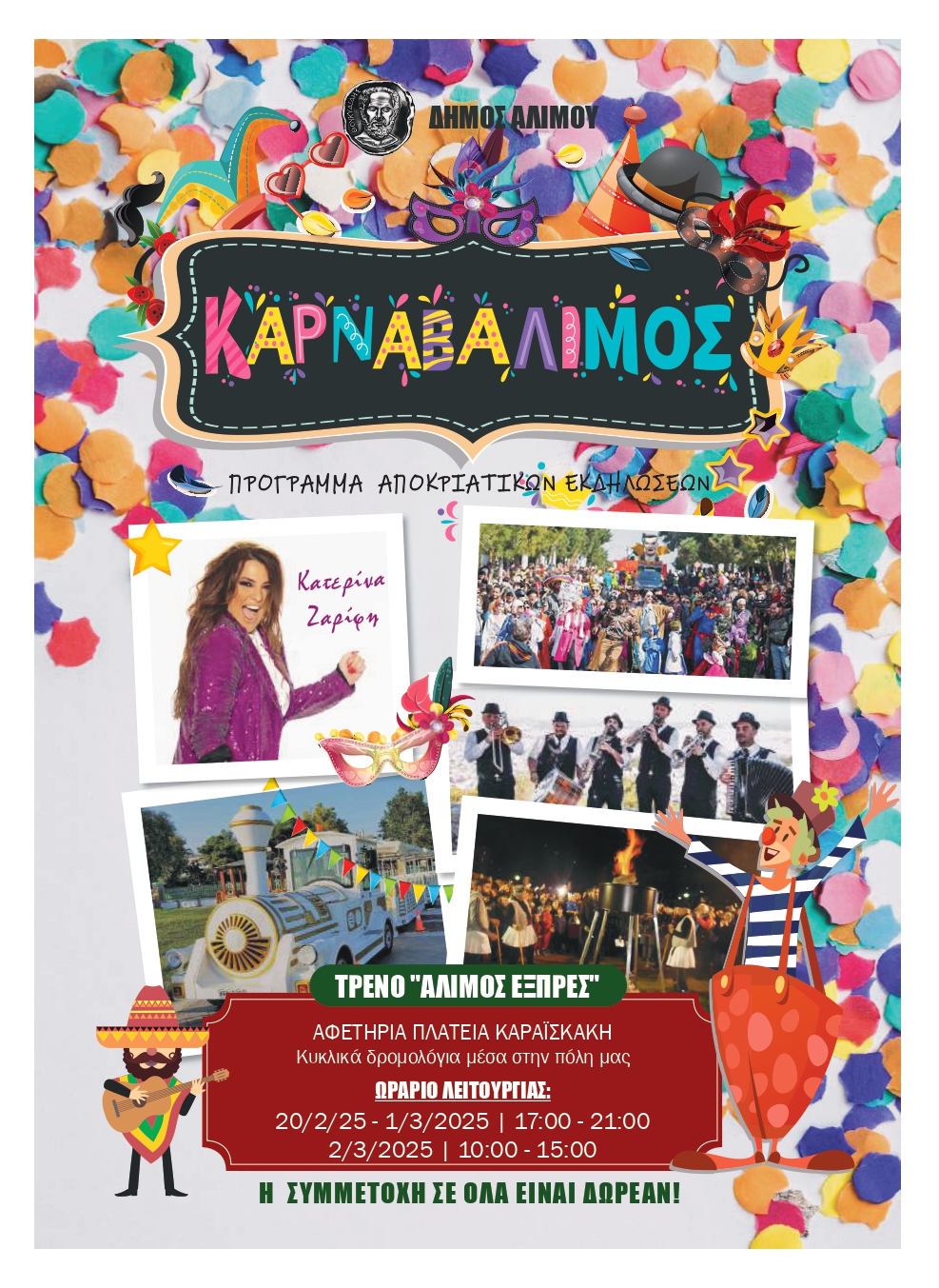 Για ακόμα μια χρονιά, ο Δήμος Αλίμου έχει διοργανώσει μια σειρά αποκριάτικων εκδηλώσεων για να χαρούν τα παιδιά και να διασκεδάσουν οι μεγάλοι, με ελεύθερη είσοδο.
