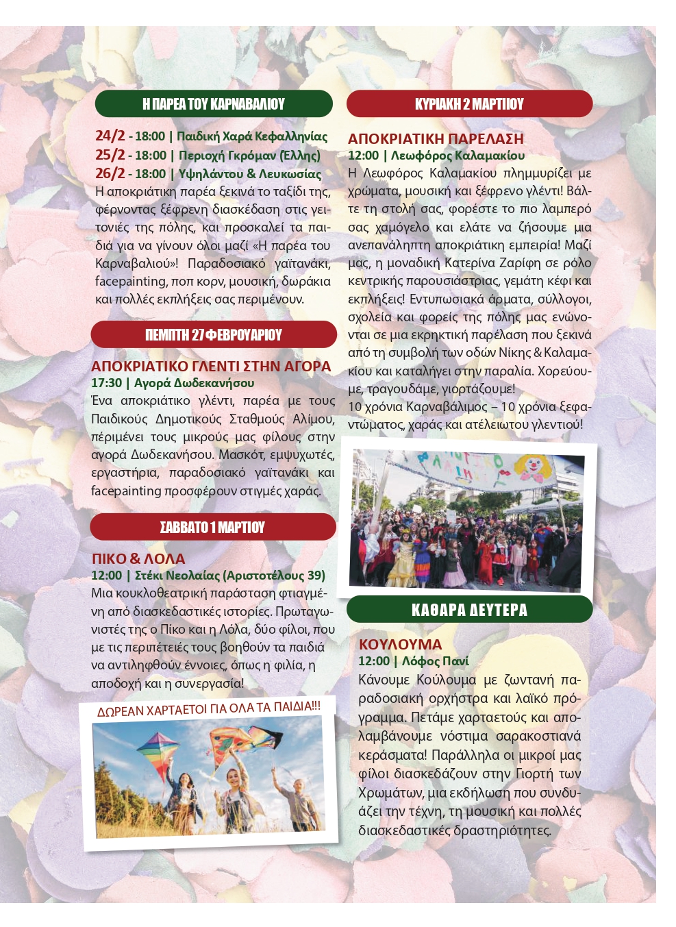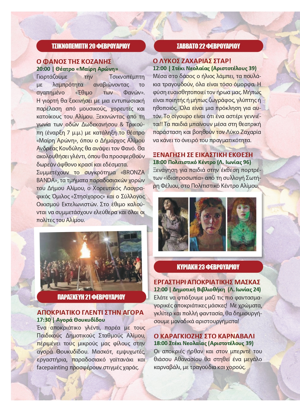 • Κυριακή 2 Μαρτίου: Μεγάλη αποκριάτικη παρέλαση της πόλης του Αλίμου στη λεωφόρο Καλαμακίου, με παρουσιάστρια την Κατερίνα Ζαρίφη