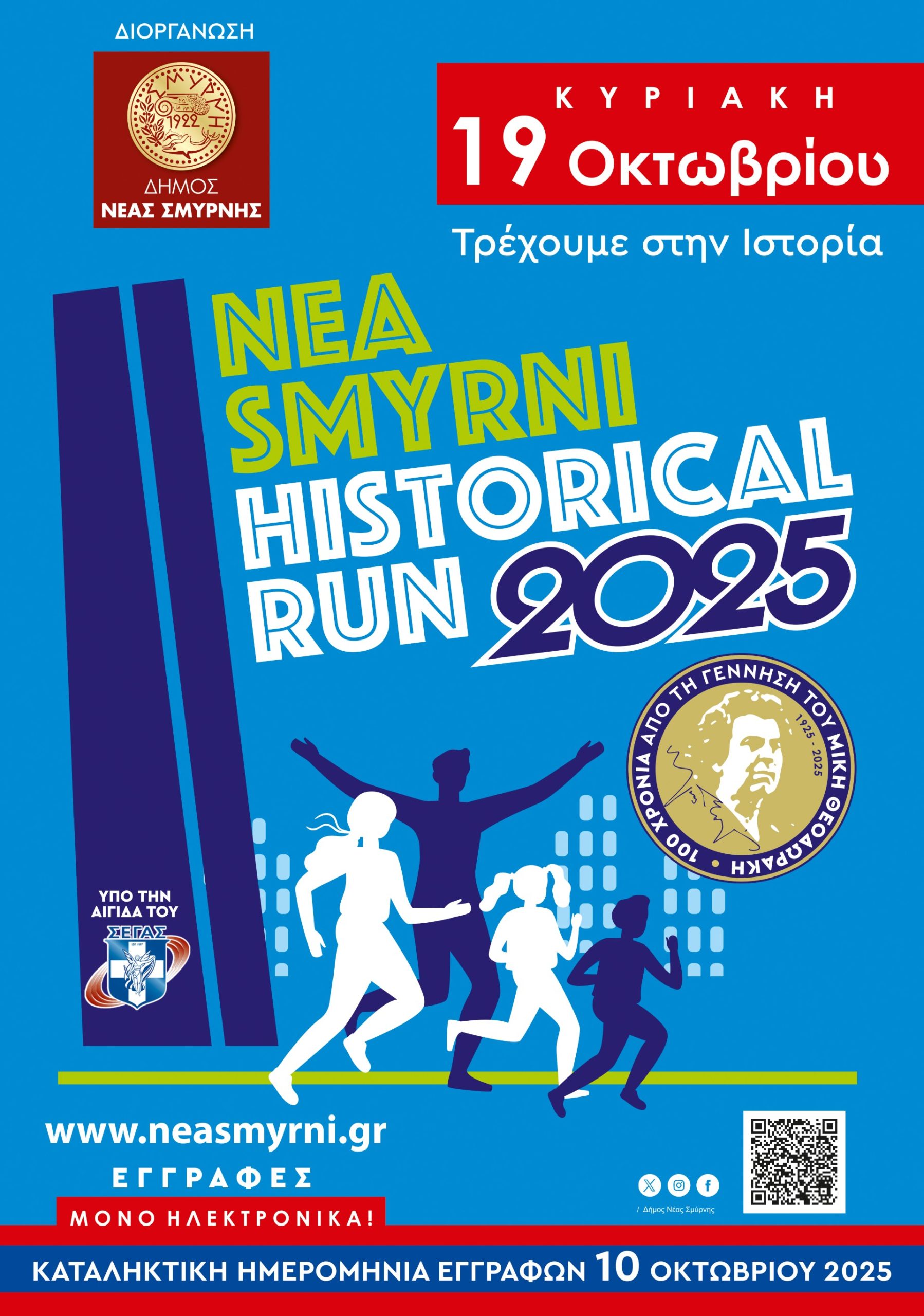 Ο καθιερωμένος Αγώνας Μνήμης «Nea Smyrni Historical Run 2025» θα πραγματοποιηθεί την Κυριακή 19 Οκτωβρίου στους δρόμους της πόλης και φέτος είναι αφιερωμένος στα 100 χρόνια από τη γέννηση του Μίκη Θεοδωράκη.