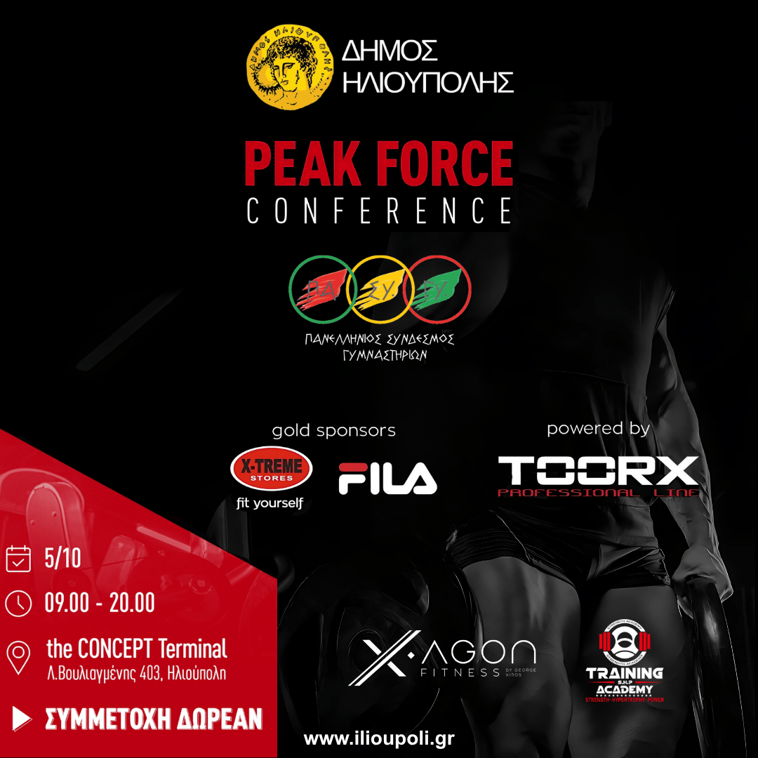 Για πρώτη φορά στην Ελλάδα, το επιστημονικό συνέδριο PEAK FORCE CONFERENCE έρχεται στην Ηλιούπολη για να παρουσιάσει όλες τις νέες εξελίξεις στην άσκηση, τη διατροφή και την αποκατάσταση, με τη συμμετοχή κορυφαίων Ελλήνων επιστημόνων και ελεύθερη είσοδο για το κοινό.