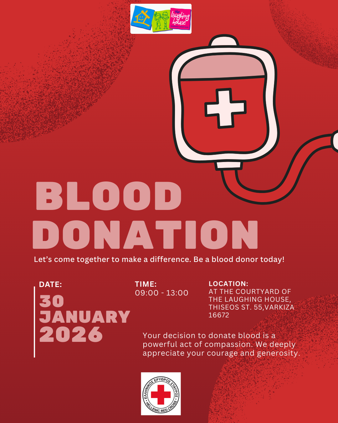 Μια ουσιαστική πράξη προσφοράς ζωής διοργανώνει την Παρασκευή 30 Ιανουαρίου 2026 το σχολείο The Laughing House, προσκαλώντας την τοπική κοινότητα να συμμετάσχει σε εθελοντική αιμοδοσία σε συνεργασία με τον Ελληνικό Ερυθρό Σταυρό.