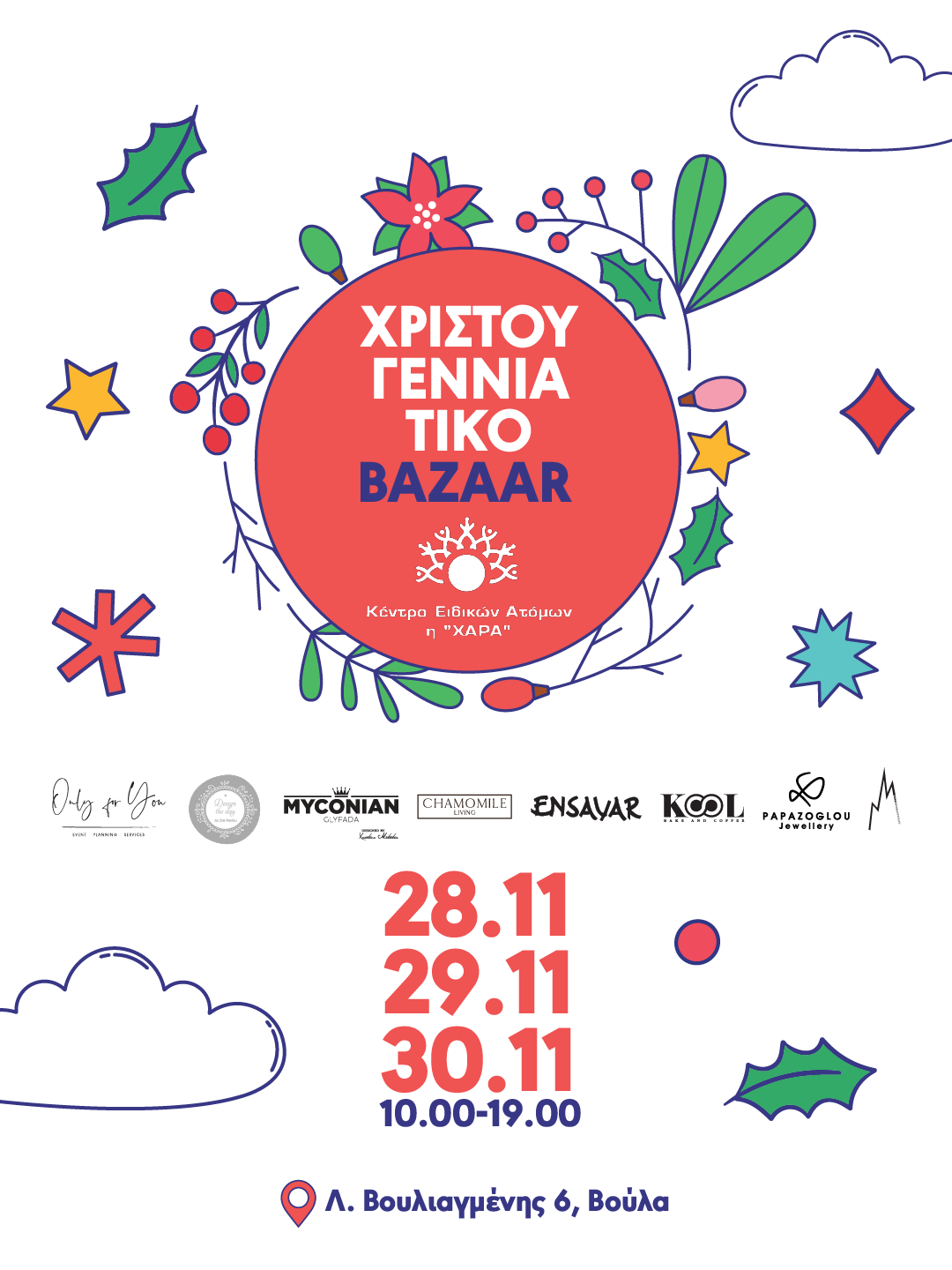 Από τις 28 έως τις 30 Νοεμβρίου, καθημερινά 10:00-19:00, το Κέντρο Ειδικών Ατόμων «Η Χαρά» σάς προσκαλεί στο Χριστουγεννιάτικο Bazaar του στη Βούλα, μια τριήμερη γιορτή προσφοράς και αγάπης που στηρίζει ουσιαστικά το έργο του.
