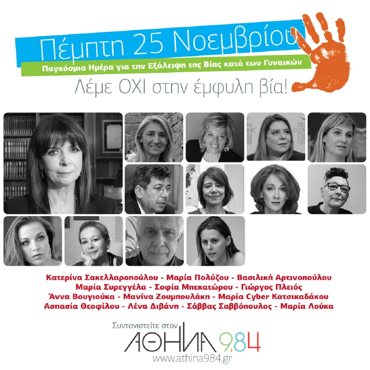 Την Πέμπτη 25 Νοεμβρίου το Ραδιόφωνο της πόλης, ο Αθήνα 9. 84, λέει με τον πιο επίσημο και ξεκάθαρο τρόπο ΟΧΙ στην έμφυλη βία. Συντονιστείτε.