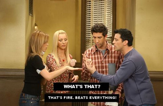 Βρισκόμαστε στον δέκατο κύκλο και η παρέα έχει αργήσει για το δείπνο την Ημέρα των Ευχαριστιών που διοργάνωνε η Monica και ο Chandler. Για να αποφασίσουν ποιος θα μπει πρώτος, επιλέγουν το παλιό και κλασικό “πέτρα, μολύβι, ψαλίδι, χαρτί”. Ο Joey επιλέγει τη φωτιά και φυσικά κερδίζει. Εωσότου η Phoebe εμπνευστεί το “μπαλόνι νερού”, αλλά αυτό ας μείνει μεταξύ μας. Τη φωτιά. Να επιλέγεις πάντα τη φωτιά.