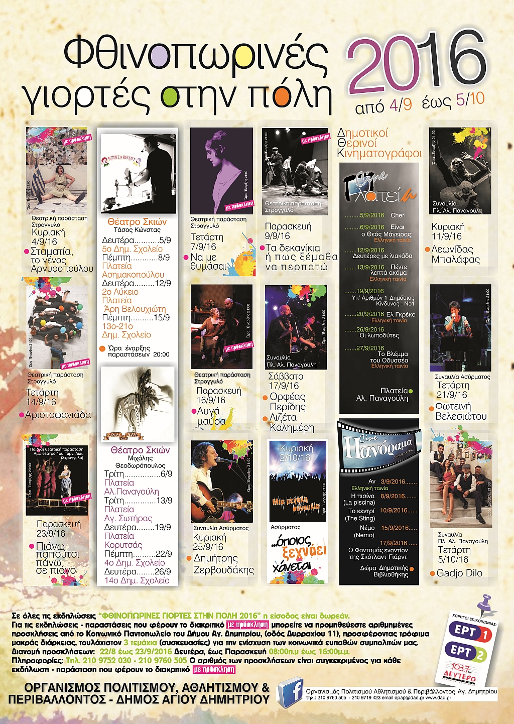 Για μια ακόμη χρονιά, ο Οργανισμός Πολιτισμού, Αθλητισμού & Περιβάλλοντος (ΟΠΑΠ) του Δήμου Αγ. Δημητρίου διοργανώνει τις “Φθινοπωρινές γιορτές στην πόλη”, που φέτος θα διαρκέσουν από 4 Σεπτεμβρίου έως 5 Οκτωβρίου 2016 με ένα πλήθος πολιτιστικών εκδηλώσεων που περιλαμβάνουν συναυλίες, θεατρικές παραστάσεις, θέατρο σκιών και κινηματογραφικές προβολές.