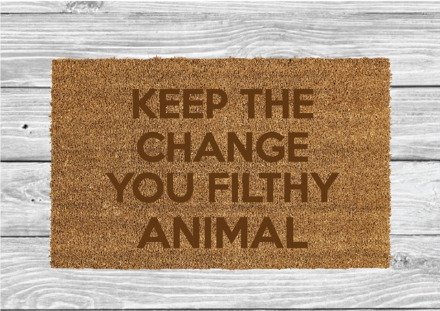 Τύπωσε σ’ ένα χαρτί τη mega ατάκα, «Keep The Change, You Filthy Animal» και στη συνέχεια κόψε το εσωτερικό τους, για να τα χρωματίσεις. Κόλλησε με κόλλα προσεχτικά πάνω στο χαλί το χαρτί/χαρτιά με την ατάκα και ξεκίνα να βάφεις. Άφησέ τα να στεγνώσουν για λίγες ώρες και επανέλαβε.