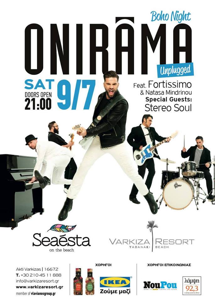 Με «παιχνιδιάρικη» διάθεση προσκαλούν επί σκηνής τις Fortissimo, το ταλαντούχο κουαρτέτο εγχόρδων από την Θεσσαλονίκη, και μαζί με ένα κλασσικό πιάνο, τις ακουστικές τους κιθάρες και τη Νατάσα Μινδρινού στα φωνητικά, εστιάζουν στη μαγεία της μουσικής και στην ουσία των τραγουδιών που όλοι αγαπήσαμε. Μέσα από ένα unplugged μουσικό ταξίδι στο χρόνο και στη δισκογραφία τους, σ’ ένα ειδυλλιακό τοπίο διπλά στη θάλασσα, οι ONIRAMA προσφέρουν ένα ξεχωριστό και ατμοσφαιρικό performance, μια και μοναδική βραδιά στην Αθήνα.