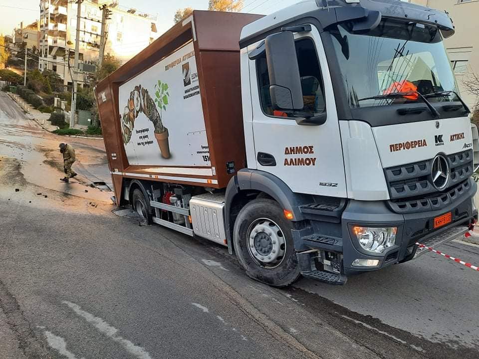 Άλιμος: Έσπασε το οδόστρωμα την ώρα που περνούσε απορριματοφόρο στην οδό Γερουλάνου