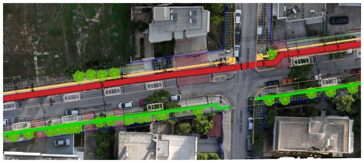 Όπως παρουσίαστηκε, η κόκκινη λωρίδα στα σχέδια είναι ο ποδηλατόδρομος, ο οποίος θα συνδέεται με τον ποδηλατόδρομο της πράσινης πολιτιστικής διαδρομής που θα ξεκινάει από τον σταθμό του μετρό και θα καταλήγει στην παραλία. Δημιουργείται ένα μεγάλο πεζοδρόμιο με πράσινο (πράσινη λωρίδα), η κίτρινη λωρίδα είναι για να κινούνται τα ΑμεΑ και οι τυφλοί. Επίσης θα δημιουργηθούν λοξές θέσεις στάθμευσης.