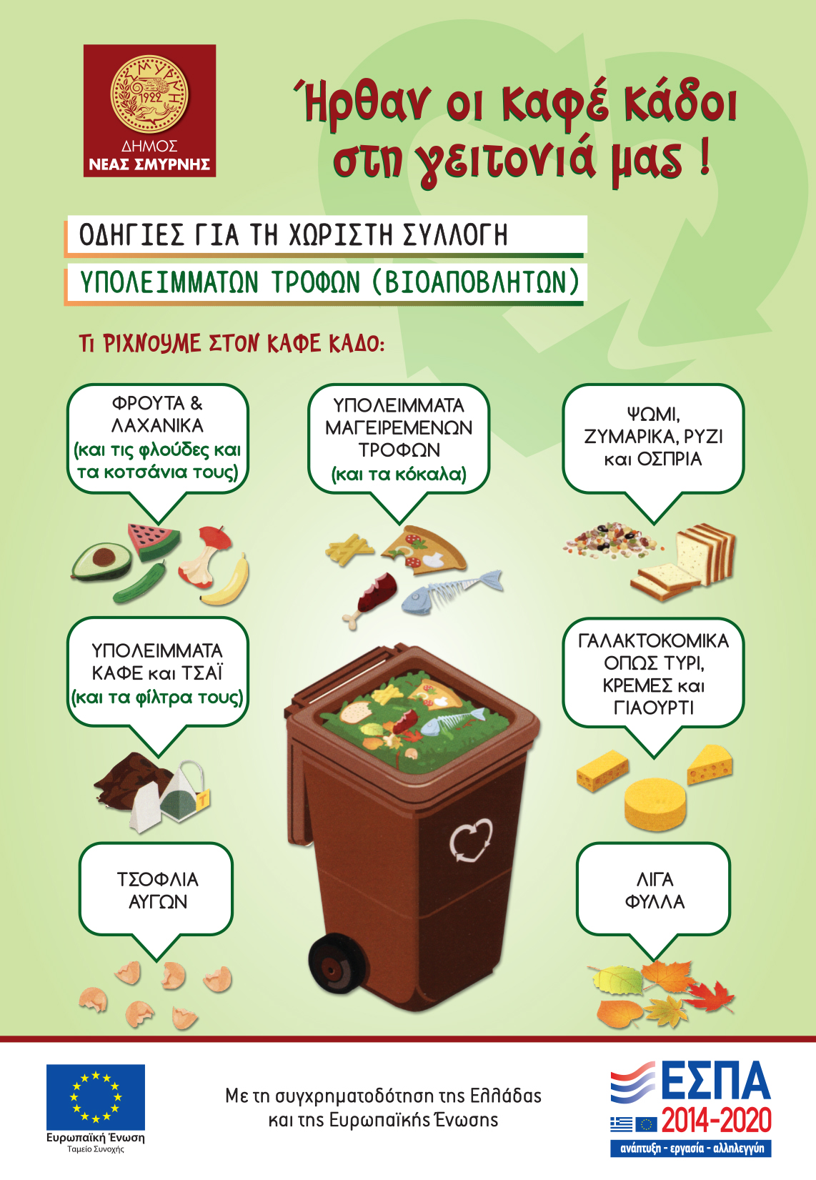 Με κεντρικό σύνθημα «Δώσε αξία στα σκουπίδια σου» ο Δήμος Νέας Σμύρνης έχει ήδη τοποθετήσει για την συλλογή βιοαποβλήτων περισσότερους από 350 καφέ κάδους σε συγκεκριμένα σημεία της πόλης που καλύπτουν κέντρα εστίασης, σούπερ μάρκετ, λαϊκές αγορές κ.λ.π