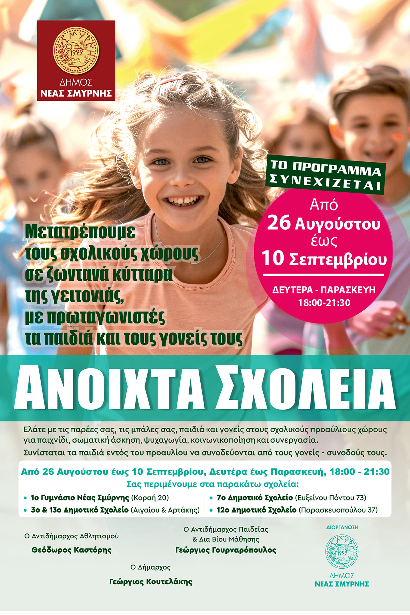 Συνεχίζεται μέχρι και τις αρχές Σεπτεμβρίου το πρόγραμμα «Ανοιχτά Σχολεία» του Δήμου Νέας Σμύρνης. Πιο συγκεκριμένα, από τις 26 Αυγούστου έως τις 10 Σεπτεμβρίου, τέσσερα σχολεία της πόλης θα παραμένουν ανοιχτά τα απογεύματα (Δευτέρα – Παρασκευή, 18:00-21:30) και θα μετατρέπονται σε ζωντανά κύτταρα της γειτονιάς με πρωταγωνιστές τα παιδιά και τους γονείς τους.