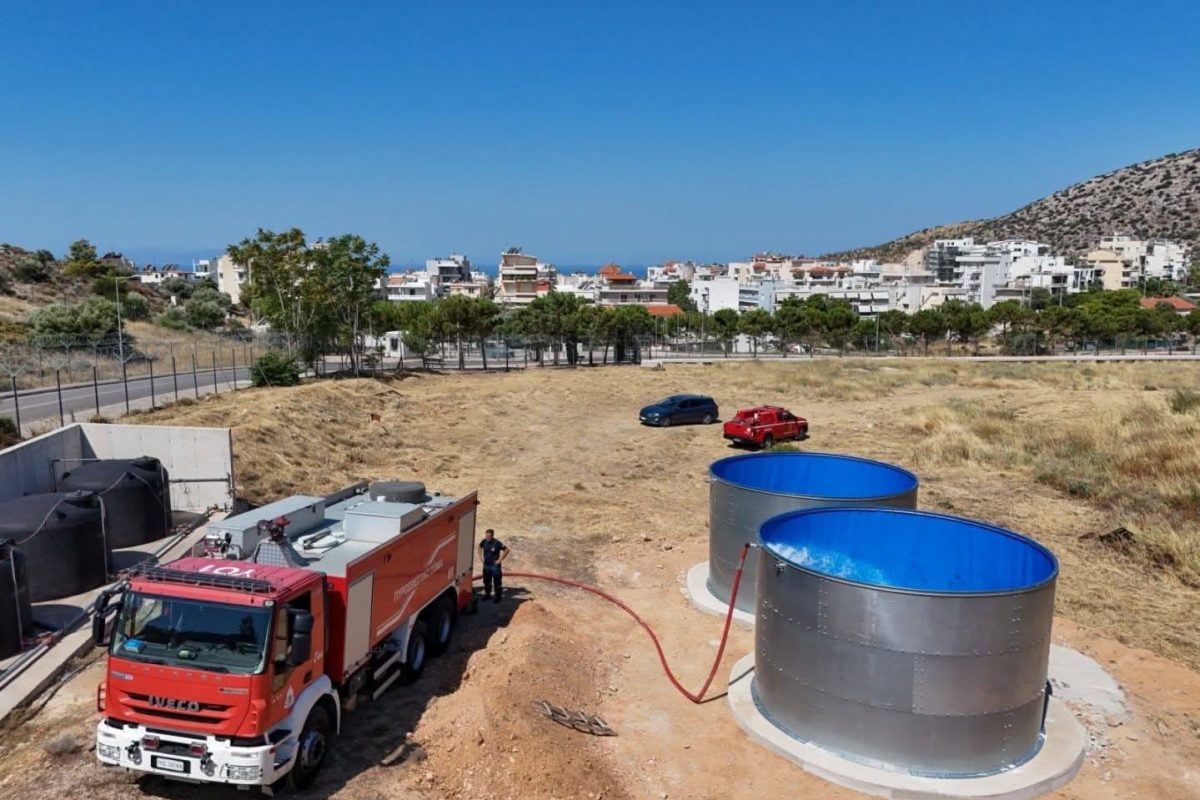 Σε πλήρη λειτουργία βρίσκονται από την Παρασκευή 27 Ιουνίου τρεις νέες δεξαμενές νερού στους πρόποδες του Υμηττού στη Γλυφάδα - Κάθε δεξαμενή έχει χωρητικότητα 50.000 λίτρων και μπορεί να υποστηρίξει τις ρίψεις εναέριων μέσων σε περίπτωση πυρκαγιάς