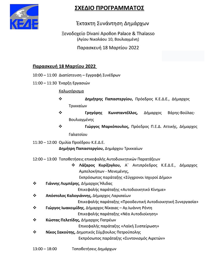 Έκτακτη συνάντηση Δημάρχων αποφάσισε η Κεντρική Ένωση Δήμων Ελλάδας η οποία θα πραγματοποιηθεί την Παρασκευή 18 Μαρτίου στο ξενοδοχείο Divani Apollon Palace στη Βουλιαγμένη.