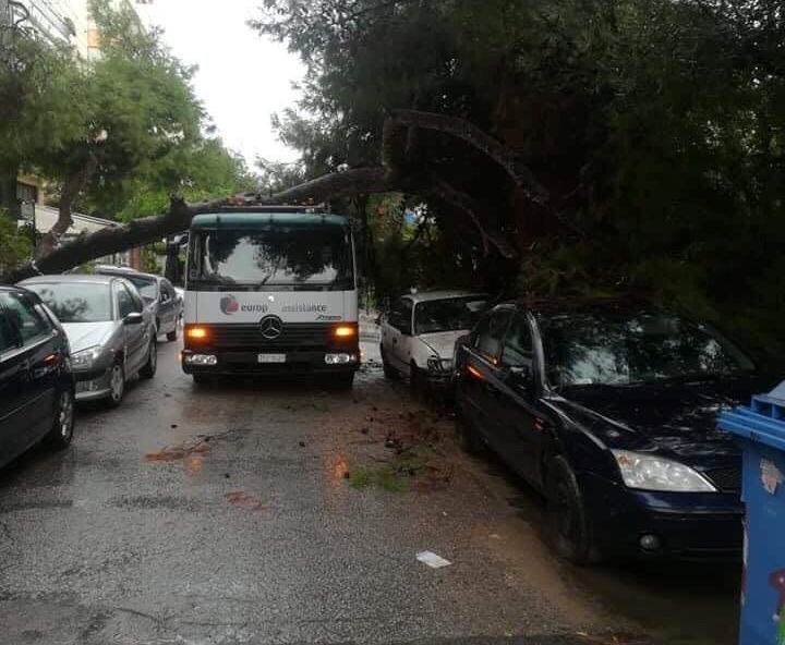 Δέντρο έπεσε πάνω σε όχημα της οδικής βοήθειας που εκείνη την ώρα περνούσε από την οδό Θεμιστοκλέους στο ύψος της οδού Παλαμηδίου στον Άλιμο.