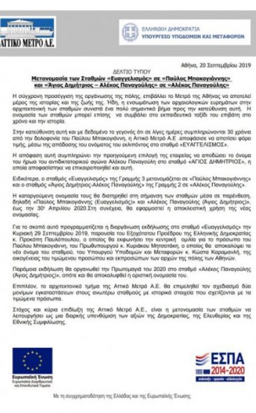 Η επίσημη ανακοίνωση της Αττικό Μετρό για δύο σταθμούς μετρό -ένας στα νότια κι ο άλλος στο κέντρο της Αθήνας- που αλλάζουν όνομα.