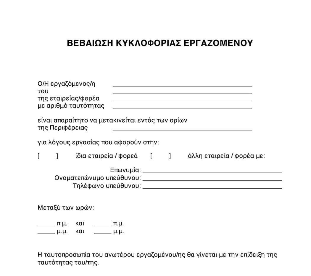 1. Έντυπο μετακίνησης. Ο πολίτης κατεβάζει τη φόρμα από την ιστοσελίδα forma.gov.gr και την συμπληρώνει πριν από κάθε του μετακίνηση. Για μετάβαση προς και από την εργασία κατά τις εργάσιμες ώρες, η βεβαίωση κίνησης είναι πάγια (τύπου Α) και παρέχεται με προσωπική ευθύνη του υπογράφοντος από τον εργοδότη ή τον νόμιμο εκπρόσωπό του σε περίπτωση νομικού προσώπου ή, σε περίπτωση ελεύθερου επαγγελματία ή αυτοαπασχολούμενου. Για όλες τις άλλες μετακινήσεις, η βεβαίωση κίνησης αφορά κάθε μεμονωμένη κίνηση και μόνο αυτή (τύπου Β), υπογράφεται από τον ίδιο τον ενδιαφερόμενο με προσωπική του ευθύνη και περιέχει το ονοματεπώνυμο, την ημερομηνία γέννησης, την διεύθυνση κατοικίας και την ώρα μετακίνησης του πολίτη, καθώς και τον συγκεκριμένο λόγο της μετακίνησης.