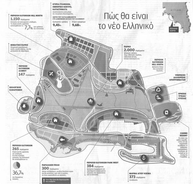 Επτά περιοχές κατοικίας, έντεκα κτίρια–τοπόσημα, μια μεγάλη εμπορική περιοχή κι ένα καζίνο είναι τα βασικά «συστατικά» του masterplan της Lamda Development για το Ελληνικό. Οι περιοχές κατοικίας αναπτύσσονται περιμετρικά του πάρκου, ενώ οι εμπορικές χρήσεις «ακουμπούν» στο μέτωπο της λεωφόρου Βουλιαγμένης. Το βάρος πέφτει στο παραλιακό μέτωπο, στον σχεδιασμό του οποίου κυριαρχούν ένας πύργος κατοικιών δίπλα στη μαρίνα κι ένα ενυδρείο.