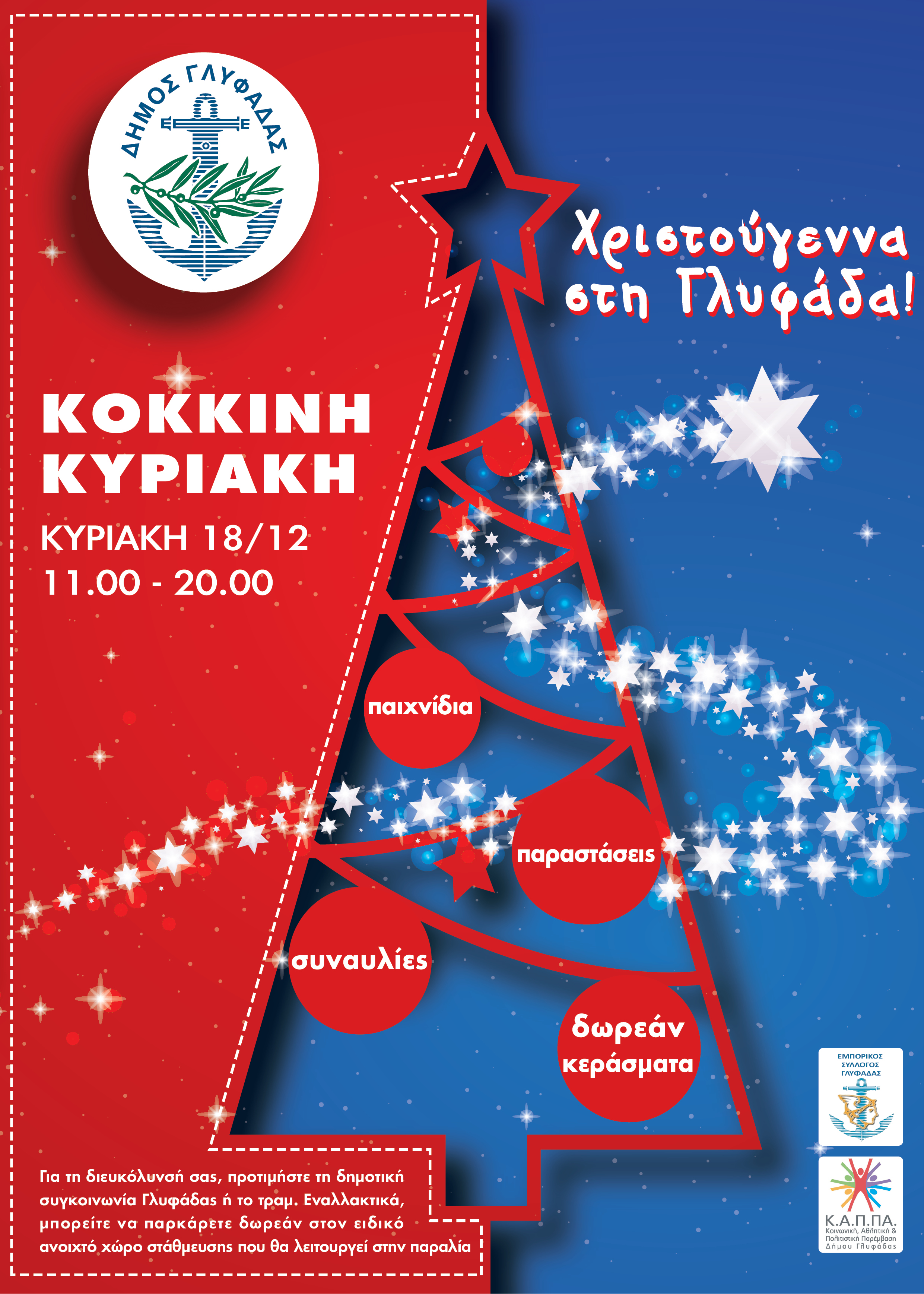 H «Κόκκινη Κυριακή», από το Δήμο Γλυφάδας σε συνεργασία με τον Εμπορικό Σύλλογο Γλυφάδας, περιλαμβάνει δεκάδες δωρεάν δράσεις για μικρούς και μεγάλους, την ημέρα όπου τα καταστήματα της πόλης θα είναι ανοιχτά από τις 11 το πρωί μέχρι τις 8 το βράδυ. Ειδικότερα, την Κυριακή, 18 Δεκεμβρίου, οι κάτοικοι και επισκέπτες της Γλυφάδας θα απολαύσουν: