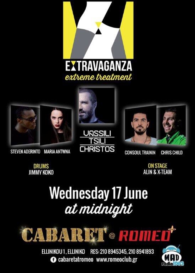 Το νέο project έχει τον ήχο και το ύφος του ανθρώπου που ορίζει και ηγείται την πρωτοπορία της νυχτερινής διασκέδασης: Ο μουσικός παραγωγός Βασίλης Τσιλιχρήστος είναι ο headliner του Extravaganza, με την παρουσία του στα decks να επισφραγίζει μια μοναδική μουσική εμπειρία, την οποία θα πλαισιώνουν περιζήτητοι εκπρόσωποι από την «αφρόκρεμα» της νέας γενιάς των djs και παραγωγών της house μουσικής, όπως ο Chris Child, η Maria Antwna, o Consoul Trainin. Στα vocals o Steven Aderinto και στα drums για ένα μοναδικό act το «δαιμόνιο» μέλος των Onirama, Jimmy Koko, ενώ η ομάδα χορευτών της Alin & X-Team θα πραγματοποιεί on stage sexy performances που θα κόβουν την ανάσα…