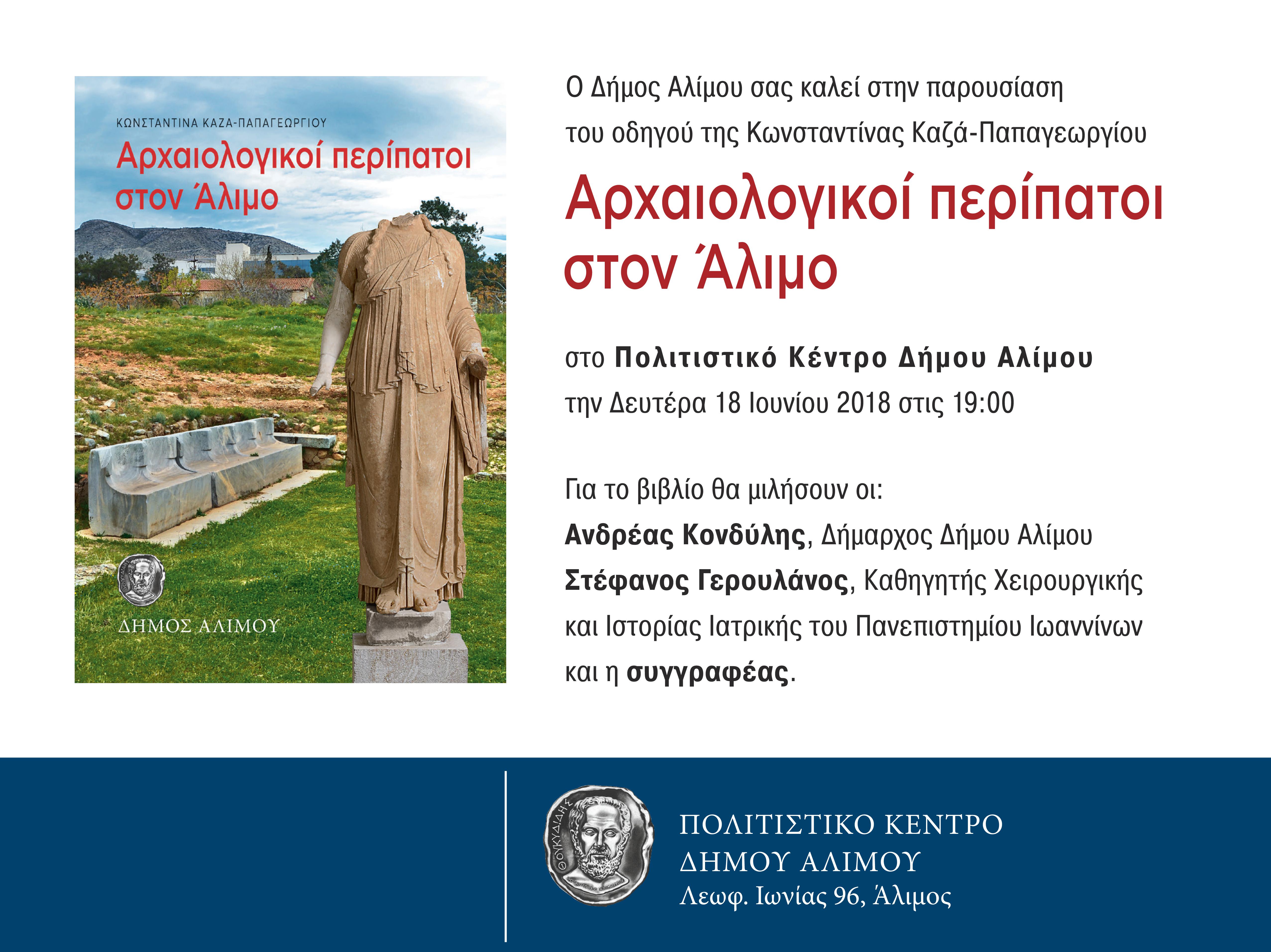 Πέντε γοητευτικές διαδρομές στην πόλη του Αλίμου περιλαμβάνονται στο καλαίσθητο βιβλίο – οδηγό που εξέδωσε ο Δήμος Αλίμου με τίτλο «Αρχαιολογικοί Περίπατοι στον Άλιμο».