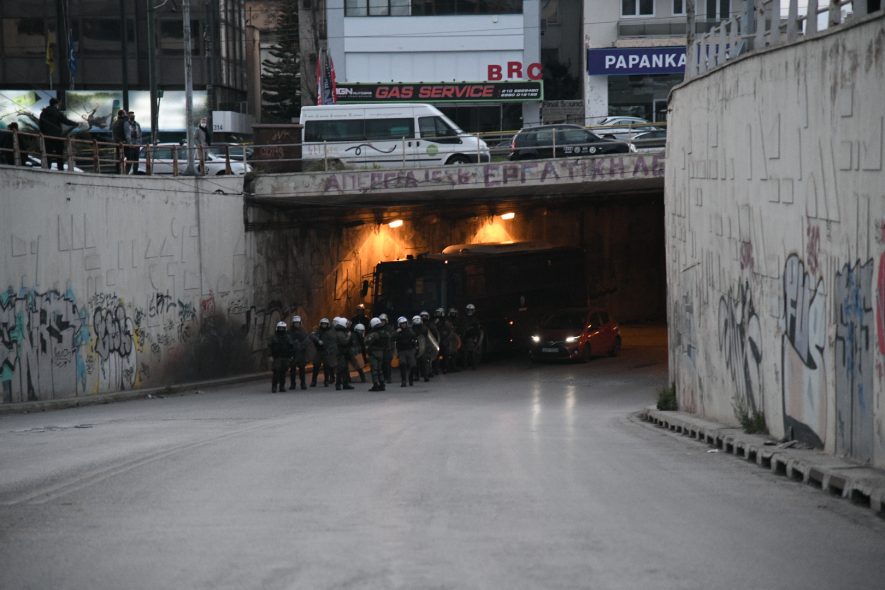 Σχετικά με το περιστατικό του μεσημεριού, η εκδοχή που δίνει η ΕΛΑΣ είναι ότι ομάδα 30-40 ατόμων επιτέθηκε με πέτρες και διάφορα αντικείμενα εναντίον των αστυνομικών. Οι ίδιες πληροφορίες κάνουν λόγο για 7 προσαγωγές και ελαφρύ τραυματισμό ενός αστυνομικού.