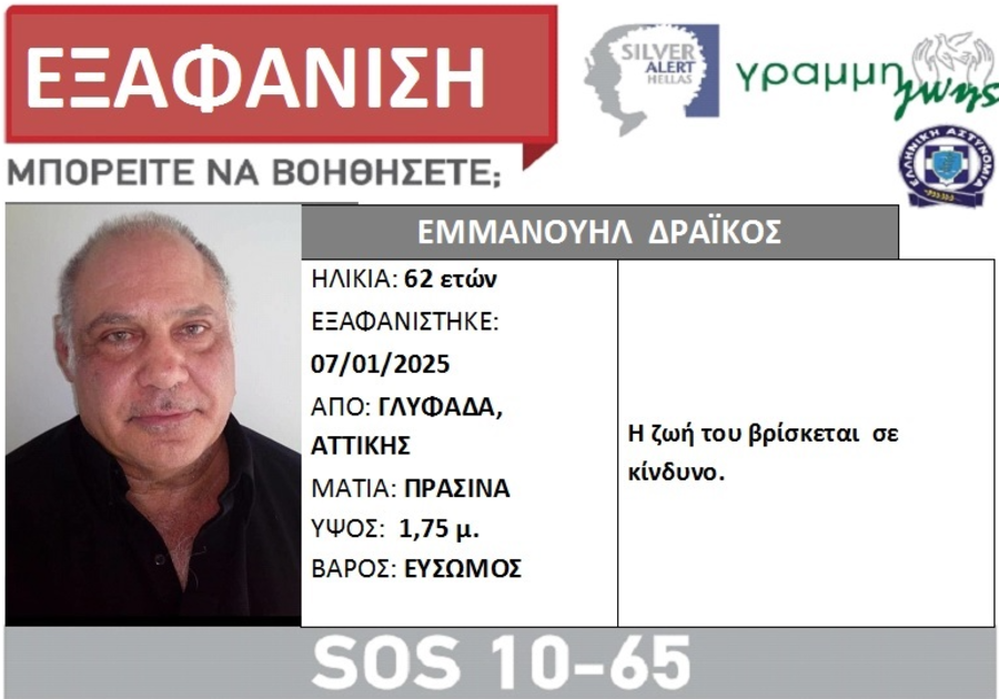 Συναγερμός έχει σημάνει στις Αρχές για την εξαφάνιση 62χρονου επιχειρηματία από τη Γλυφάδα. Όλα ξεκίνησαν στις 7 Ιανουαρίου, όταν το όχημά του βρέθηκε σταθμευμένο στην Ομόνοια, ξεκλείδωτο, με τα κλειδιά και το κινητό τηλέφωνο του επιχειρηματία στο εσωτερικό του οχήματος. Οι πρώτες εκτιμήσεις έκαναν λόγο για κλοπή, ωστόσο όταν οι αστυνομικοί προσπάθησαν να εντοπίσουν – μέσα από τις πινακίδες του αυτοκινήτου – τον ιδιοκτήτη, ο άνδρας δεν εντοπίστηκε.