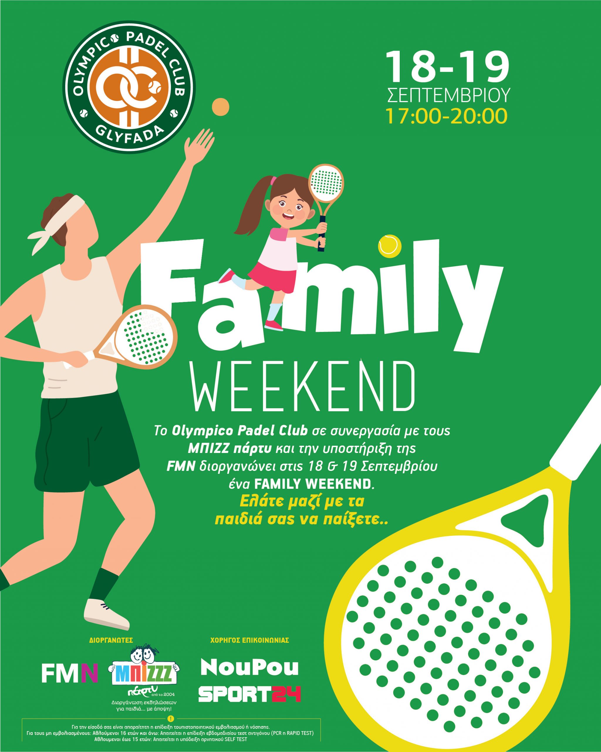 Το Olympico Padel Club σε συνεργασία με τους “ΜΠΙΖΖ πάρτυ” και την υποστήριξη της FMN διοργανώνει στις 18 & 19 Σεπτεμβρίου ένα family weekend. Από τις 17:00 έως τις 20:00, τόσο το Σάββατο όσο και την Κυριακή, οι “MΠΙΖΖ” θα βρίσκονται στις εγκαταστάσεις του Olympico και θα παρέχουν προγράμματα δημιουργικής απασχόλησης για τους μικρούς φίλους του club, ενώ οι γονείς θα μπορούν να απολαύσουν έναν αγώνα padel.