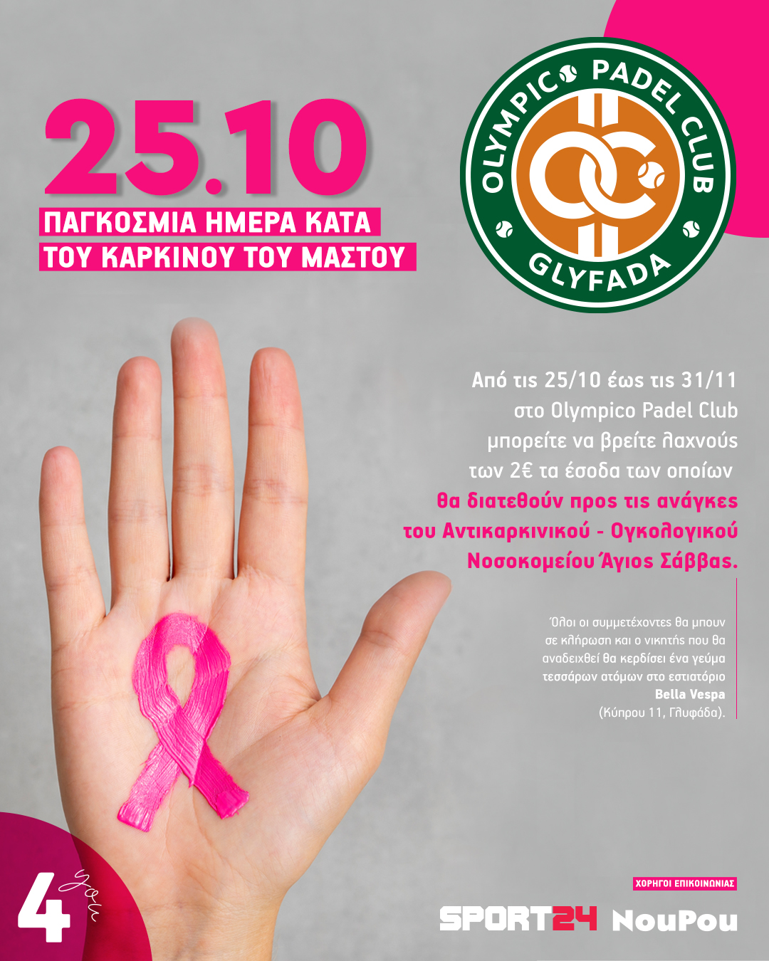 Από τη Δευτέρα έως και την Κυριακή στο Οlympico Padel Club θα πωλούνται λαχνοί των 2€ τα έσοδα των οποίων θα διατεθούν προς τις ανάγκες του του Αντικαρκινικού – Ογκολογικού Νοσοκομείου Άγιος Σάββας. Όλοι οι συμμετέχοντες θα μπουν σε κλήρωση και ο νικητής που θα αναδειχθεί θα κερδίσει ένα γεύμα τεσσάρων ατόμων στο εστιατόριο Bella Vespa (Kύπρου 11, Γλυφάδα).