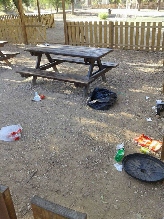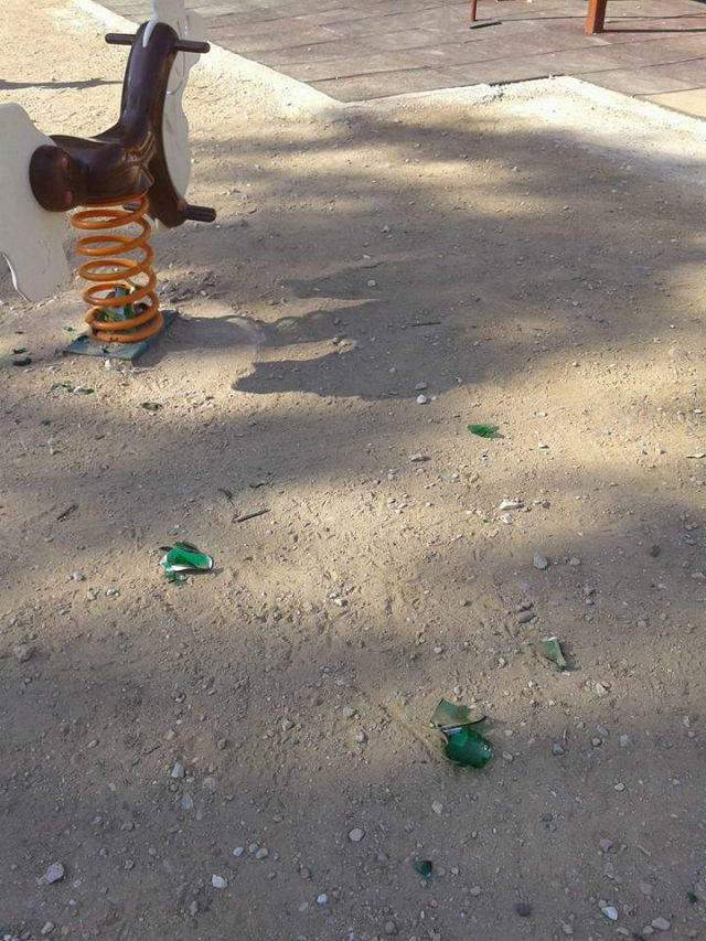 Οι άγνωστοι, εκτός των άλλων, άφησαν πολλά σπασμένα γυαλιά μέσα στις κούνιες, αδιαφορώντας για το γεγονός ότι εκεί παίζουν μικρά παιδιά.