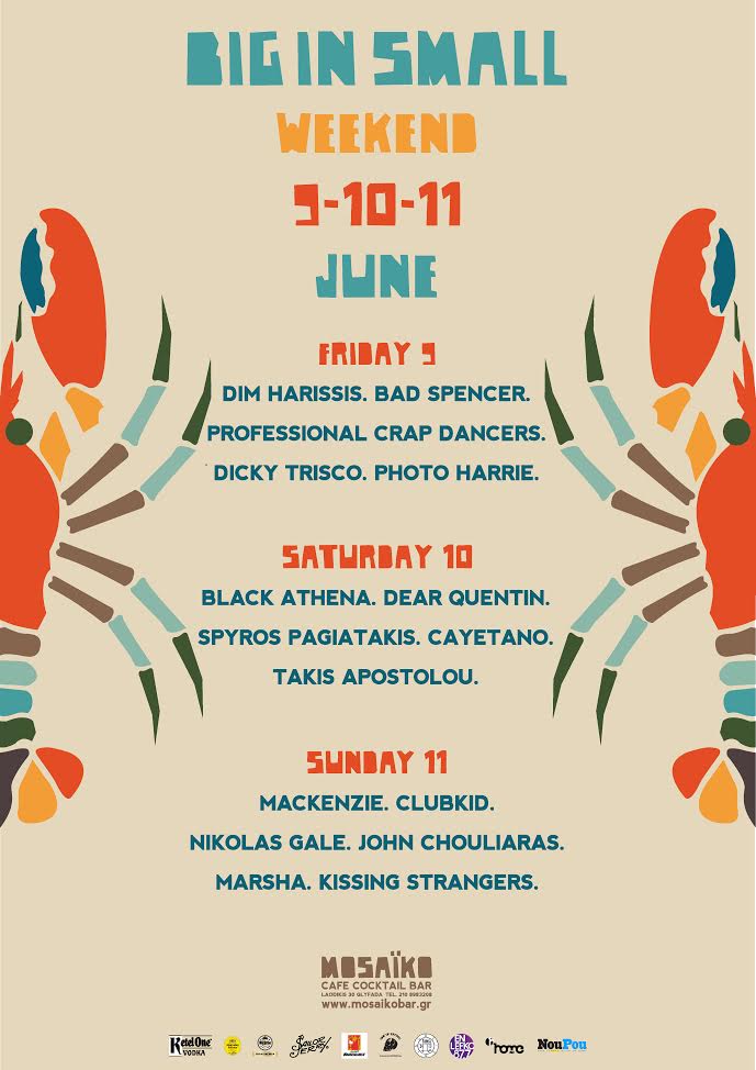 Τρεις μέρες και νύχτες και 18 Έλληνες DJs & Παραγωγοί συνθέτουν το Big In Small Weekend που θα πραγματοποιηθεί, για 2η συνεχόμενη χρονιά, αποκλειστικά στο Mosaiko στις 9, 10 & 11 Ιουνίου.