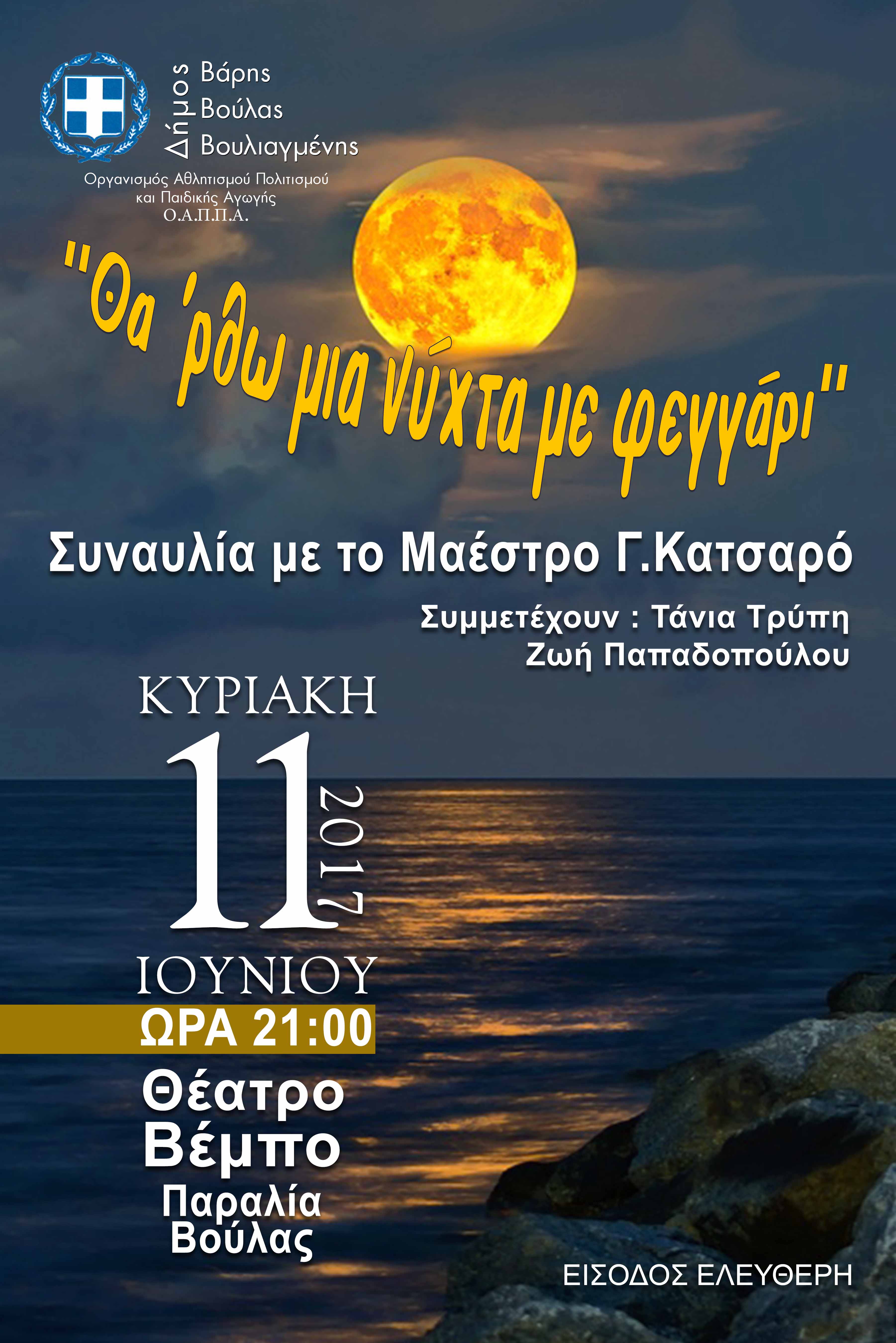 Συναυλία με τίτλο «Θα ‘ρθω μια νύχτα με φεγγάρι», με το Γιώργο Κατσαρό, την ορχήστρα του, την Τάνια Τρύπη και την Ζωή Παπαδοπούλου διοργανώνει ο Οργανισμός Αθλητισμού Πολιτισμού και Παιδικής Αγωγής του Δήμου Βάρης Βούλας Βουλιαγμένης (ΟΑΠΠΑ) την Κυριακή 11Ιουνίου και ώρα 21.00, στο Θέατρο Βέμπο, στην παραλία της Βούλας.