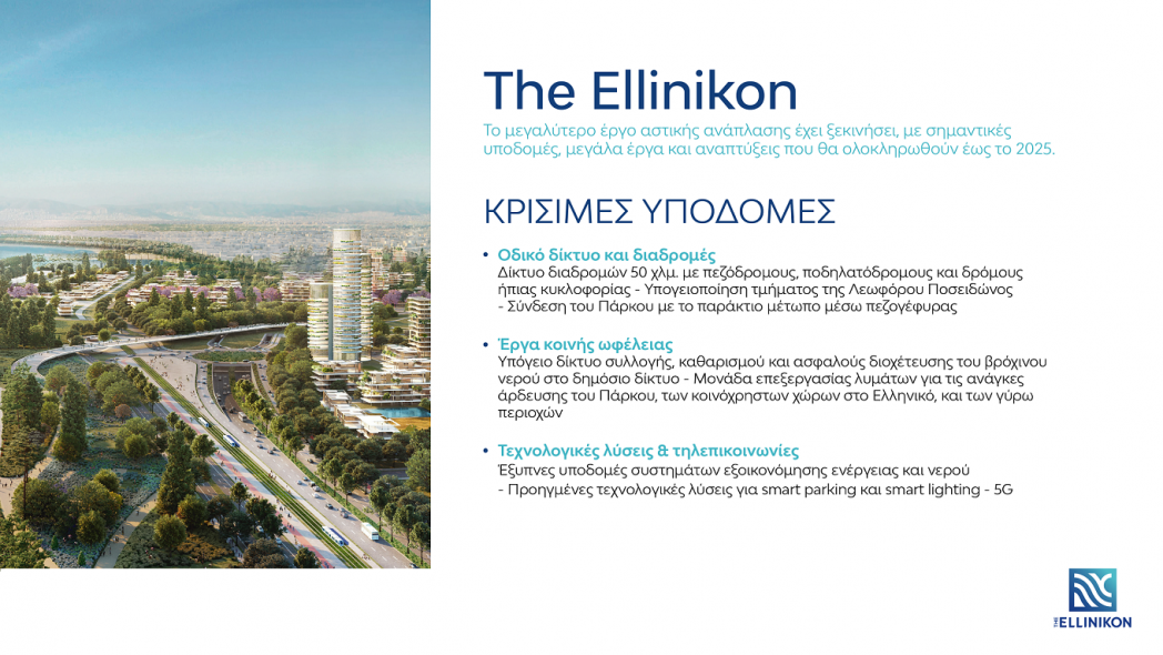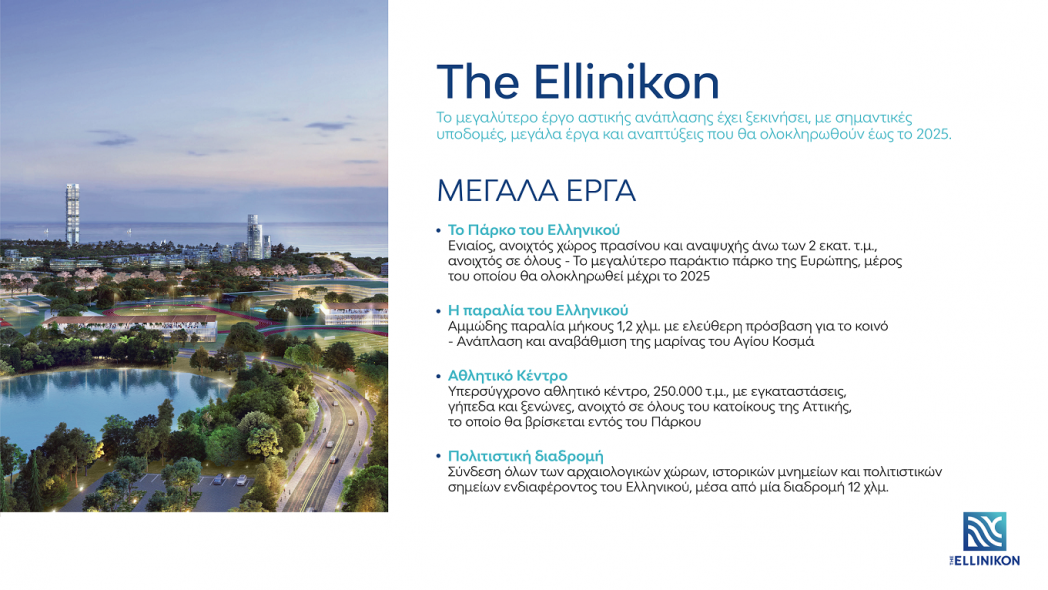 «Το Ελληνικό ξεκίνησε και έως το 2025 ένα μεγάλο μέρος του θα είναι έτοιμο, ώστε όλοι οι πολίτες να μπορούν να το ζήσουν και να νιώσουν υπερήφανοι. Μία περιοχή που σήμερα είναι δύσκολα προσβάσιμη και αποκομμένη από τον αστικό ιστό θα μεταμορφωθεί τα επόμενα χρόνια, αποκλειστικά με ιδιωτική χρηματοδότηση, σε μία σύγχρονη πράσινη πόλη που θα μπορούμε όλοι μας να επισκεπτόμαστε και να απολαμβάνουμε. Το Ελληνικό είναι η πρώτη περιοχή στην Ελλάδα που θα αναπτυχθεί από την αρχή ως μία έξυπνη πόλη, με προηγμένες υποδομές και καινοτόμες τεχνολογίες, ενώ σχεδιάστηκε ώστε να είναι περιβαλλοντικά βιώσιμο και ανθεκτικό στην κλιματική αλλαγή», ανέφερε, στο πλαίσιο της παρουσίασης, ο Διευθύνων Σύμβουλος της Lamda Development, Οδυσσέας Αθανασίου.