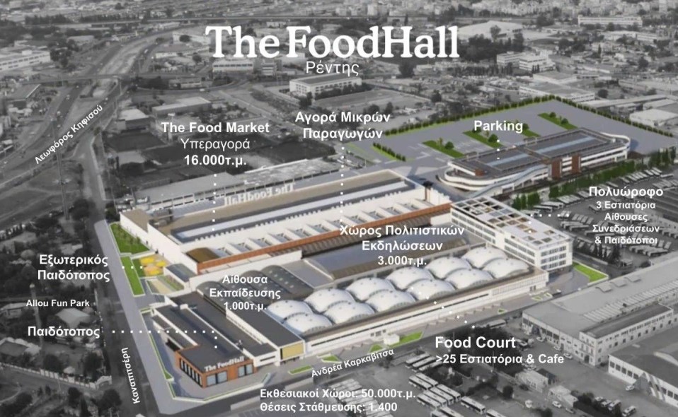 Οι εκθεσιακοί χώροι του FoodHall θα καλύπτουν 50.000 τ.μ. και θα περιλαμβάνουν μια υπεραγορά 16.000 τ.μ., με ξεχωριστό τμήμα αφιερωμένο σε μικρούς παραγωγούς και ελληνικά προϊόντα, ενώ το Food Court θα φιλοξενεί 25 εστιατόρια και καφέ με μεγάλη ποικιλία γεύσεων. Παράλληλα, θα διαθέτει πολυχώρους εκδηλώσεων που περιλαμβάνουν πολιτιστικό χώρο 3.000 τ.μ., εκπαιδευτική αίθουσα 1.000 τ.μ. και ειδικά διαμορφωμένες αίθουσες για συνεδριάσεις και δραστηριότητες.