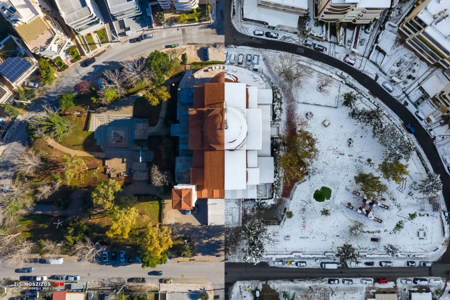 Μια εντυπωσιακή σειρά φωτογραφιών με την ανοιξιάτικη Γλυφάδα των τελευταίων ημερών από τη μία και το χιονισμένο alter ego τους από την άλλη.