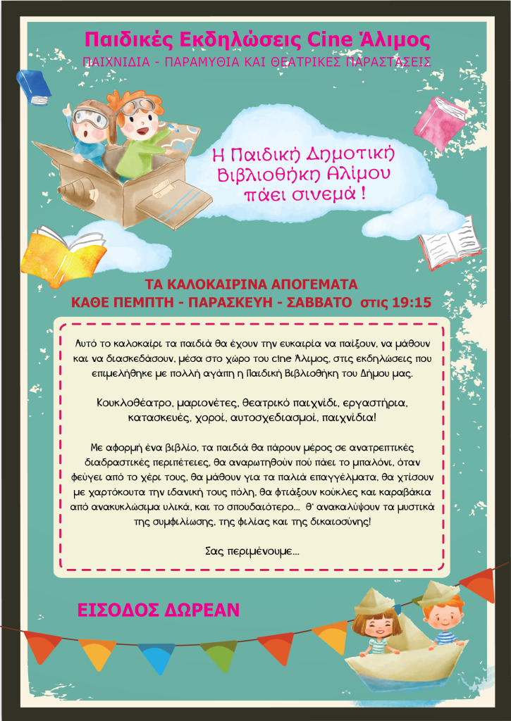 Αυτό το καλοκαίρι παίζουμε, μαθαίνουμε και διασκεδάζουμε, μέσα στο χώρο του Cine Άλιμος. Τα παιδιά θα συναντήσουν αγαπημένους συγγραφείς, θα απολαύσουν διαδραστικές αφηγήσεις, θα παίξουν θεατρικό παιχνίδι, θα φτιάξουν όμορφες κατασκευές και θα δημιουργήσουν το δικό μας παραμύθι.