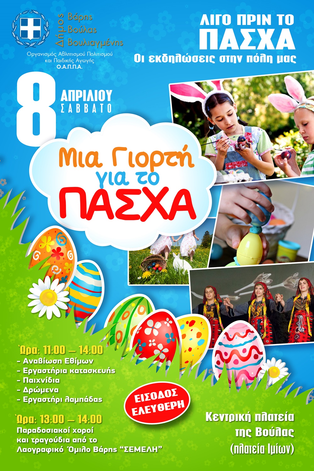 Ο Δήμος Βάρης Βούλας Βουλιαγμένης, μέσω του Οργανισμού Αθλητισμού Πολιτισμού και Παιδικής Αγωγής (ΟΑΠΠΑ) γιορτάζει το Πάσχα με ένα πλούσιο πρόγραμμα εκδηλώσεων με τίτλο «Λίγο πριν το Πάσχα» το οποίο απευθύνεται σε παιδιά και ενήλικους.